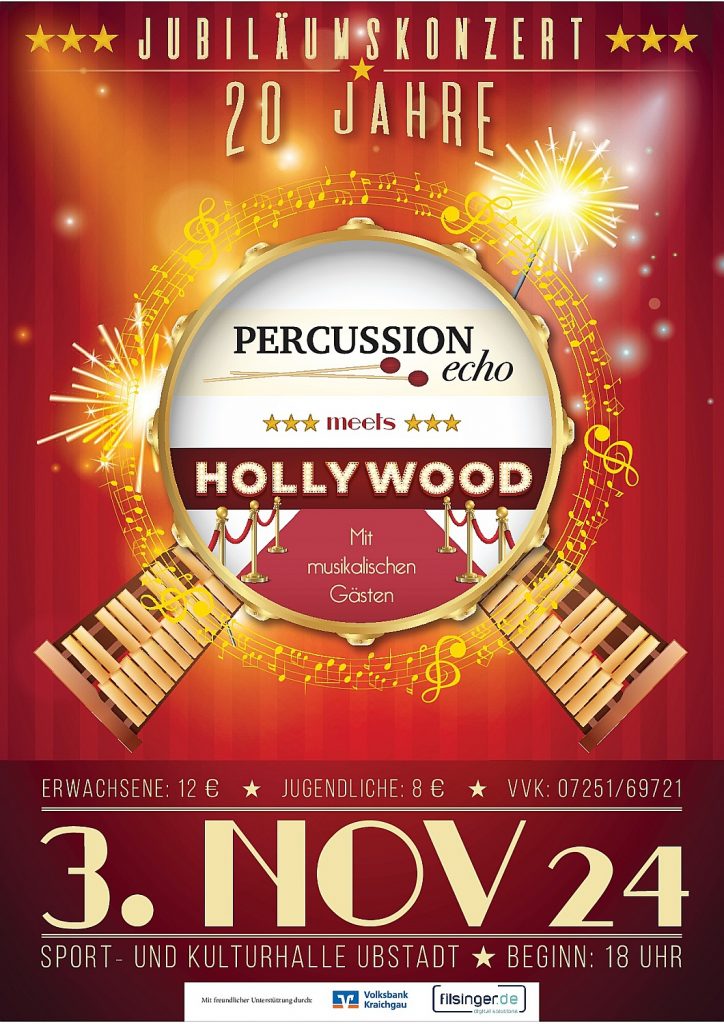 Virtuose Percussion-Musik sowie mitreißende Gesangstitel verspricht das Konzert „Percussion echo meets Hollywood“, das am Sonntag, 03. November 2024 (Beginn: 18.00 Uhr), in der Sport- und Kulturhalle Ubstadt stattfindet.