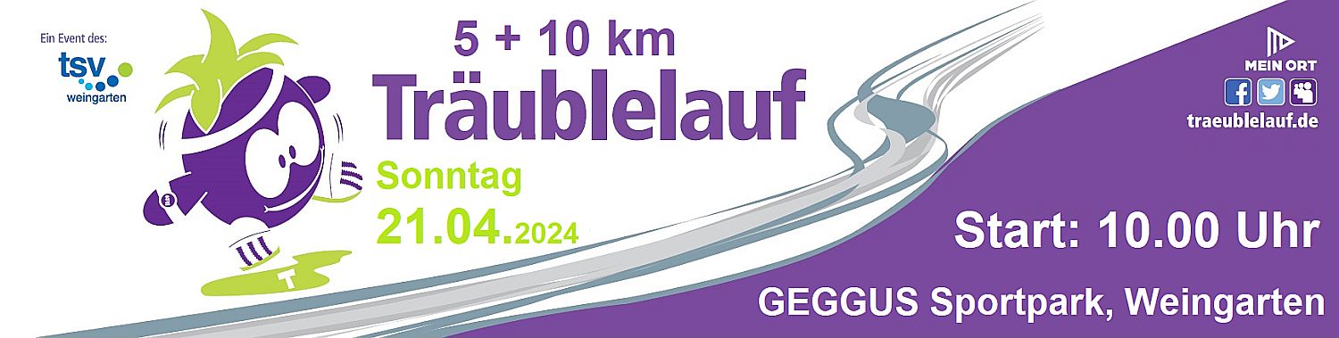 Am Sonntag, 21. April 2024, sind wir beim 3. Träublelauf am GEGGUS Sportpark in Weingarten dabei!