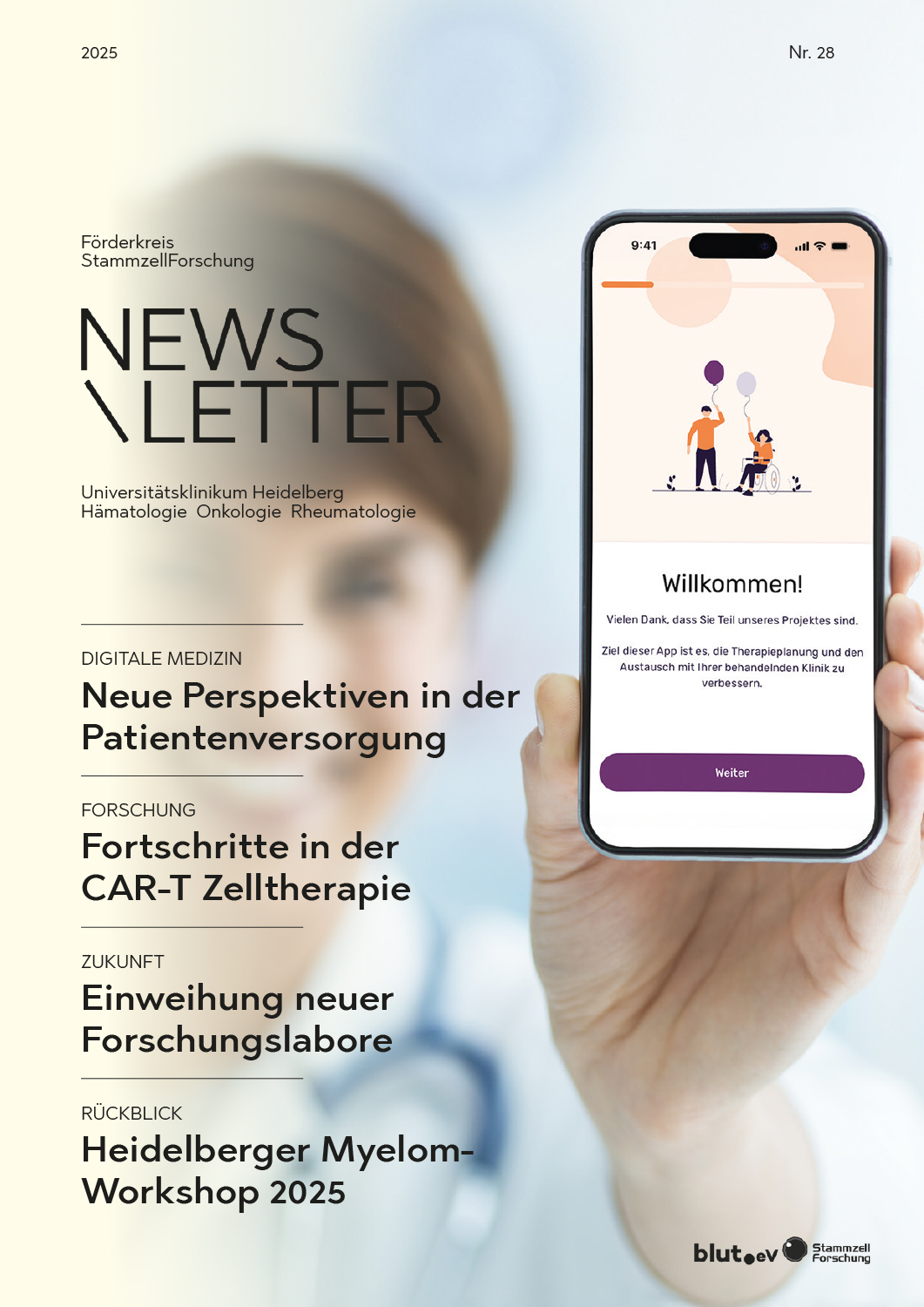 In dieser Ausgabe laden wir Sie ein, sich über die faszinierenden Entwicklungen in der digitalen Medizin zu informieren, neue Perspektiven kennenzulernen, die sich durch unsere telemedizinische Plattform und App für Patientinnen und Patienten mit CAR-T Zelltherapie eröffnen, und die jüngsten Fortschritte in der CAR-T Zelltherapie nachzuvollziehen. Außerdem berichten wir ausführlich vom Heidelberger Myelom Workshop 2025 und stellen Ihnen unsere frisch eröffneten Forschungslabore in der Eppelheimer Straße vor.